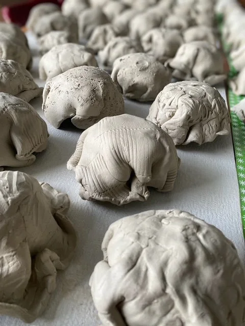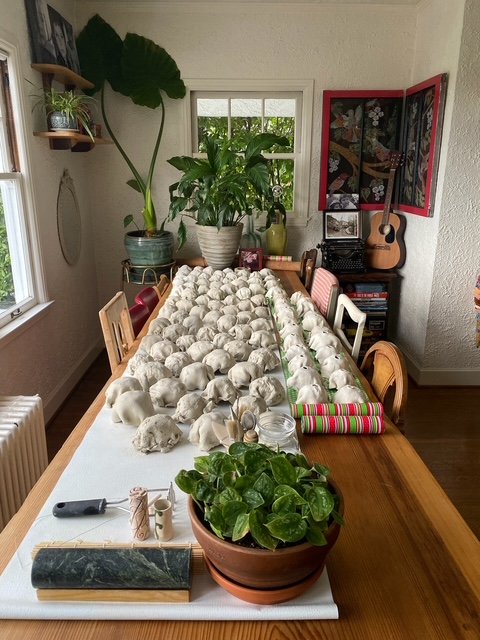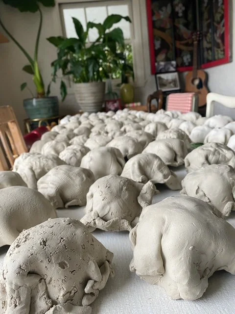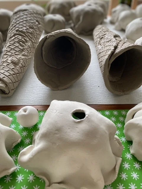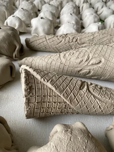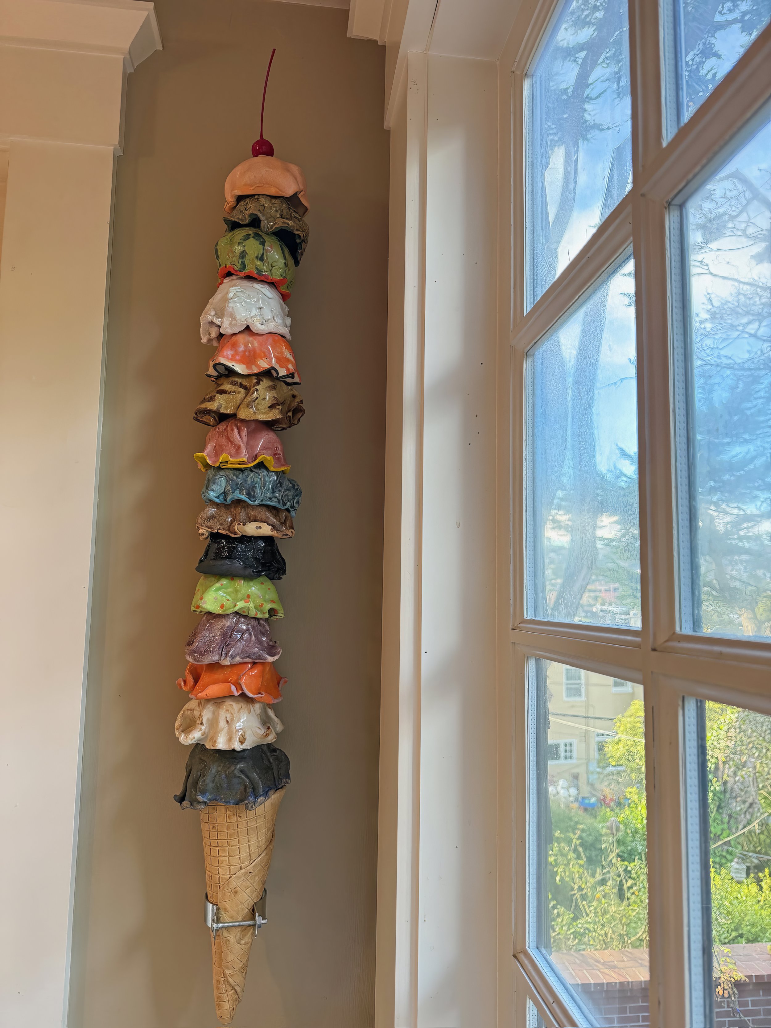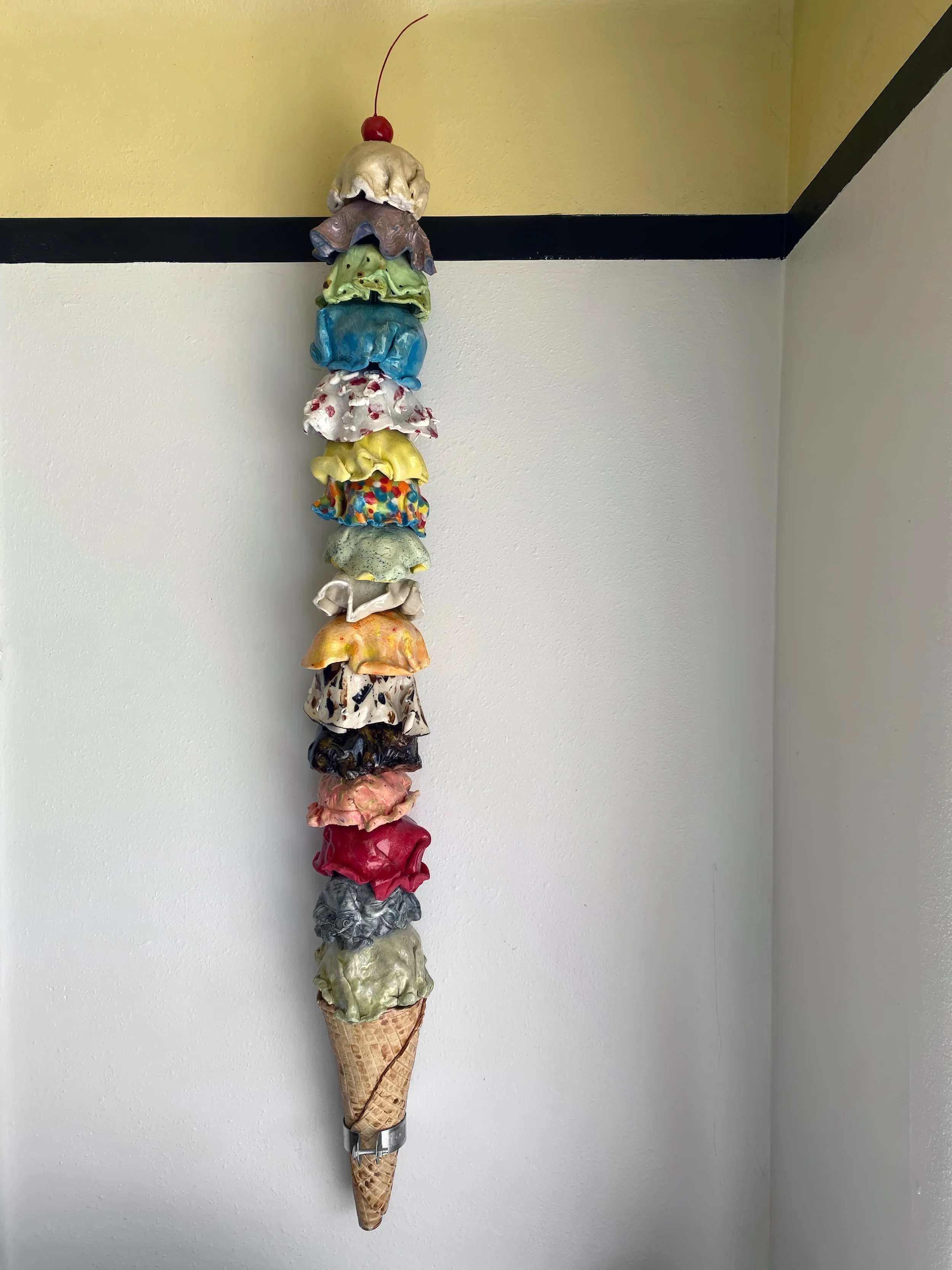 Tasha crafts an ice cream cone specially for every client. You may have favorite flavors or a color theme in mind. Maybe it’s a tricky space and you want it to travel beyond the wall. One scoop for each grandchild perhaps? Maybe you want 10 feet all vanilla! Or 20 feet of mint chip…or jalapeño carrot cake for Heavens sake! Maybe you want to win the world record for owning the tallest ceramic ice cream cone EVER MADE. Or one that winds around the living room. (Literally.) Tasha Miller will make it happen. Even if you just want two scoops, straight up.