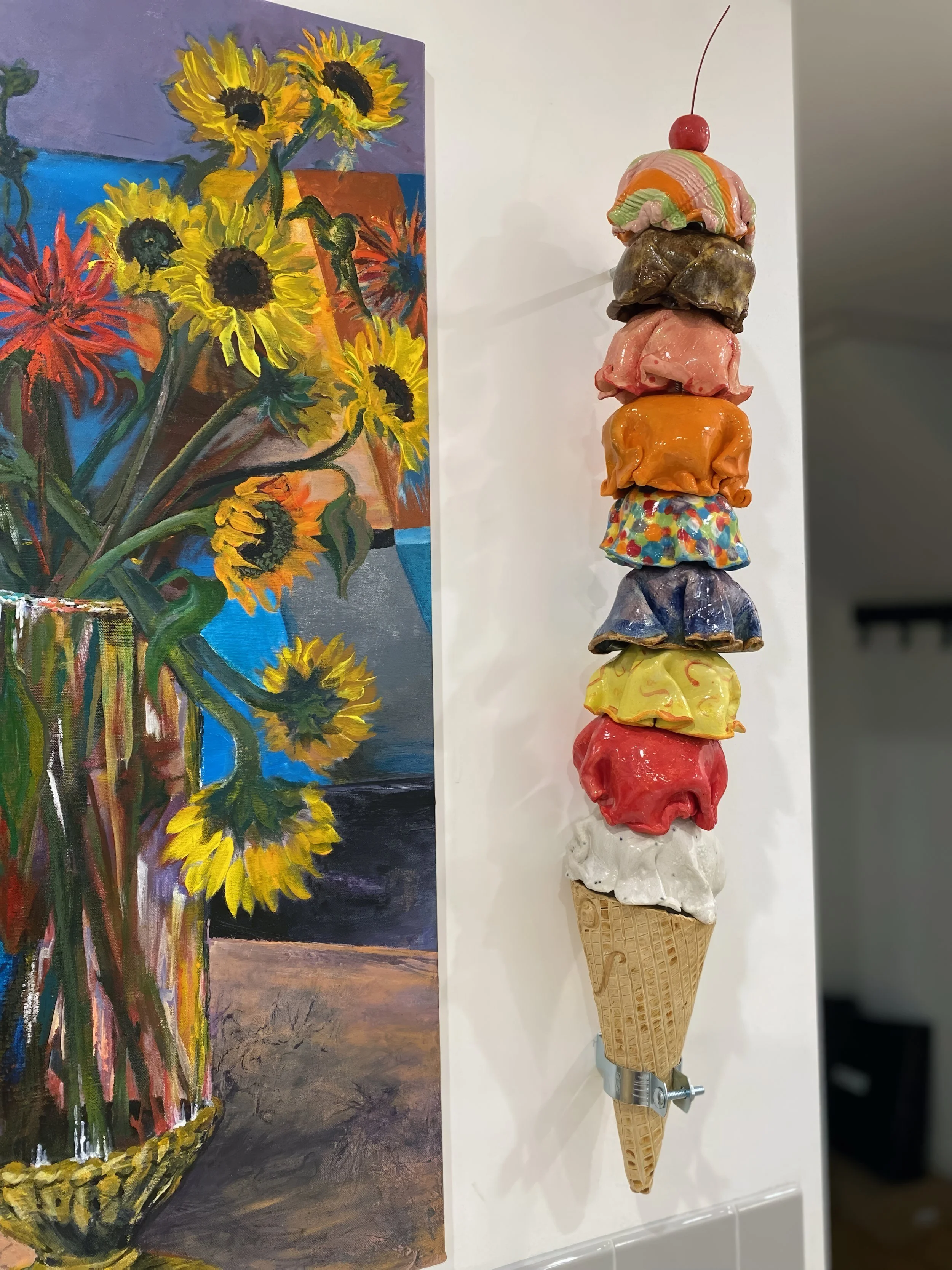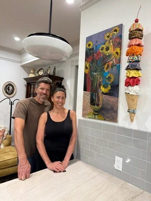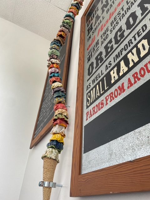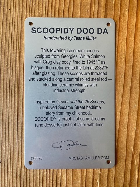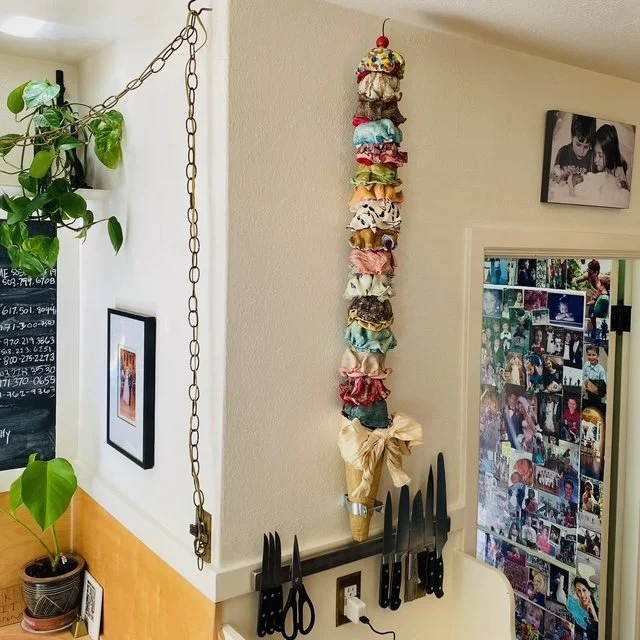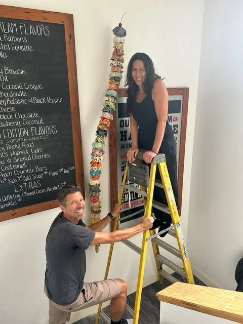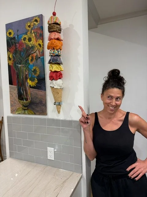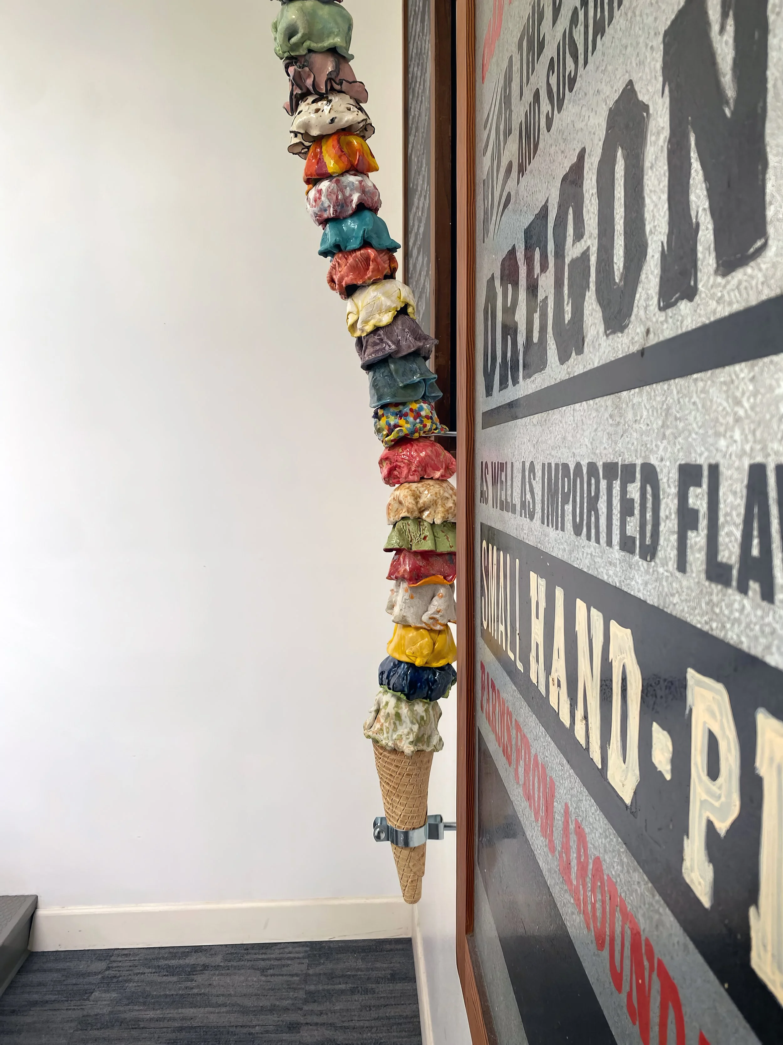 Ice Cream Our Life. The whimsically crafted, vibrantly colored, and impossibly stacked scoops on Tasha Miller's sculpture is a powerful metaphor for the precarious, fleeting, yet sweet, nature of life. This art is deeply personal: the artist invited us to customize every scoop - from "Snowy Peaks" marshmallow to "Oh Hi, Ojai" orange to “Coeur D’Alene Huckleberry" - allowing each color and flavor to represent a part of our family's life. We treasure the symbolism and delight in the whimsy.