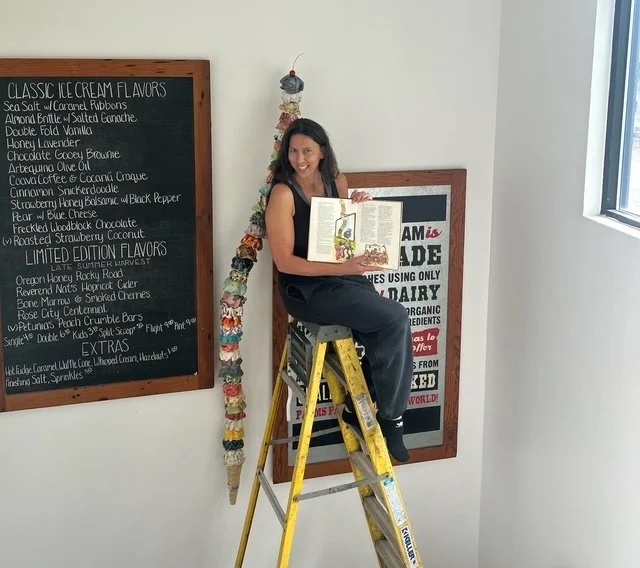 It all started staring at page 20 in my old Sesame Street Bedtime Storybook from the 1970s. I make freakishly impossible ice cream cones because [with little Herbie and Betty Lou] I watched Grover do it! “Grover and the 26 Scoops” by Patricia Thackray is everything! The illustrations (by Marc Nadel) of the story at Ye Olde ABC Ice Cream Parlor are delightful! SCOOPIDY is a stunning vertical chaos that I hope to see decorate living rooms, museums and ice cream shops across the globe. In this world, it’s pretty safe to say everyone loves ice cream. I made the first cone for our Portland family home, Valentina. She is 8 feet high with 51 scoops. Three of them are my favorite, mint chip. When my littlest piano students walk past the cone on the way to their living room lesson, they like to stop and stare, contemplating the flavors and how this all came to be. I tell them to listen to their dreams.
